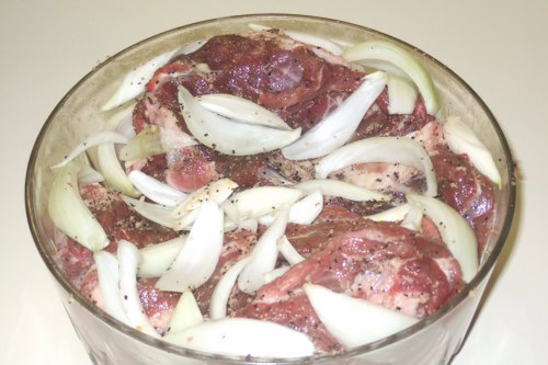 Put the lamb in a big bowl. Rub it with grill seasoning. Add a sliced onion all around the meat. Allow the meat to marinate for at least 3 hours or overnight in a refregirator.